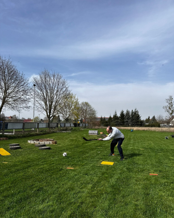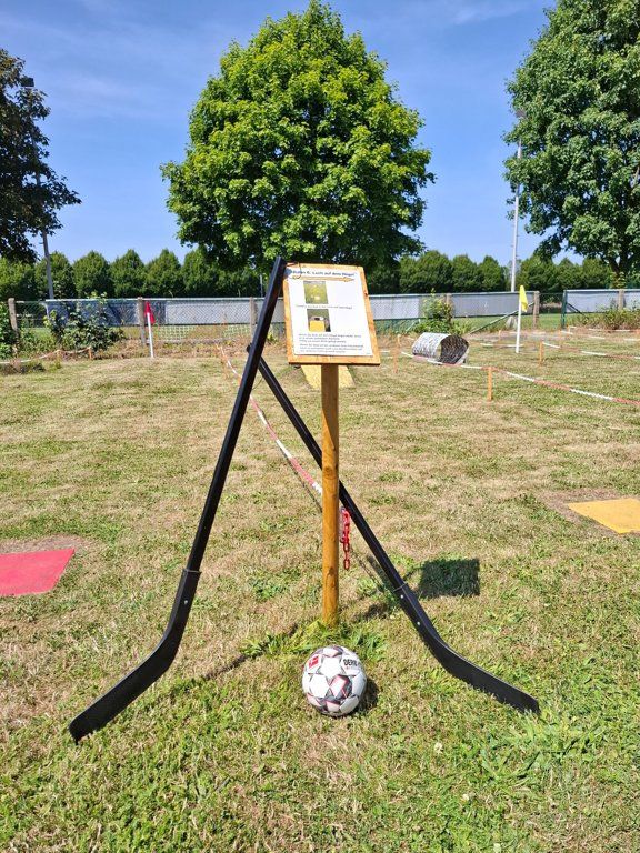 Minigolf mit dem Fuß, der Hand oder dem Hockeyschläger spielen.